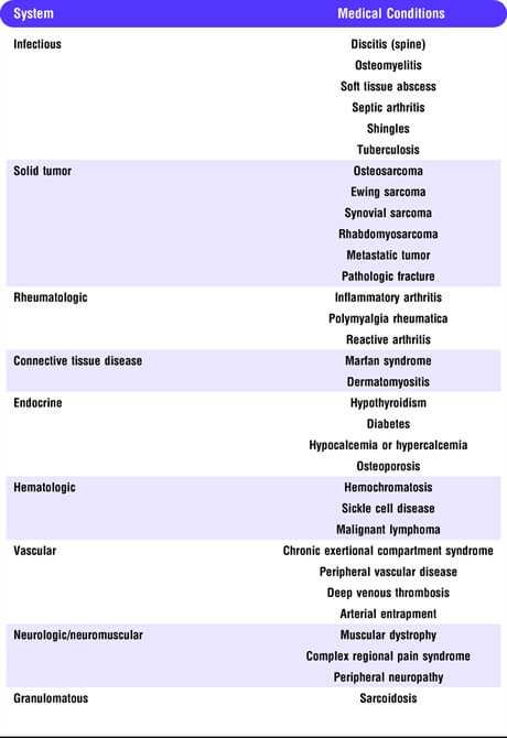 Accurate diagnosis begins with consideration of the list of possible diagnoses for the patient’s symptoms, known as the differential diagnoses. Differential diagnoses, because of their scope and level of detail, are difficult to master. It is impossible to memorize an exhaustive differential for every symptom presentation. One should be taught, instead, to think in terms of systems. Table 1 presents a systems approach to medical conditions that may mimic sports medicine conditions. Note that this list is not comprehensive. For example, there are many bone tumors not listed, and some medical conditions, such as tuberculosis and sarcoidosis, are capable of mimicking just about any other condition because of the wide variety of types of tissues that they can affect.